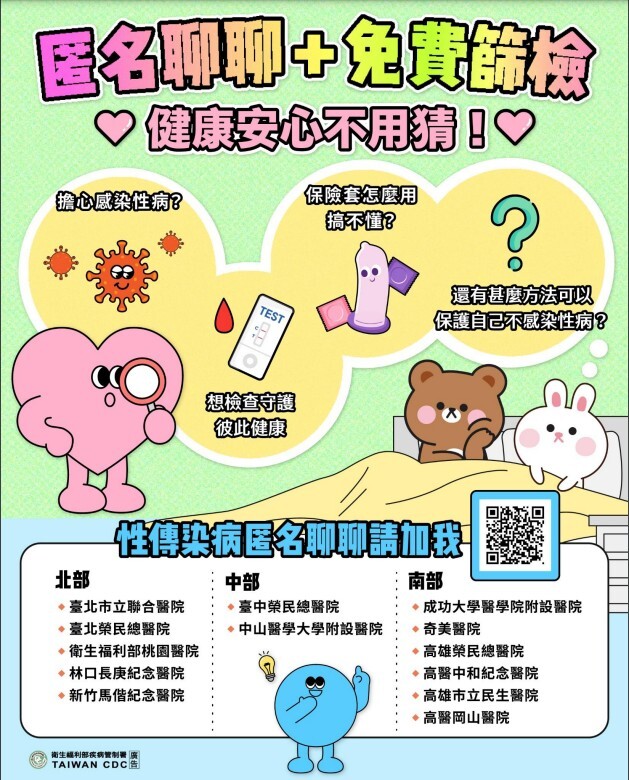 疾管署推「匿名聊聊」與「年輕族群免費梅毒篩檢」服務,健康安心不用猜!(JPG)